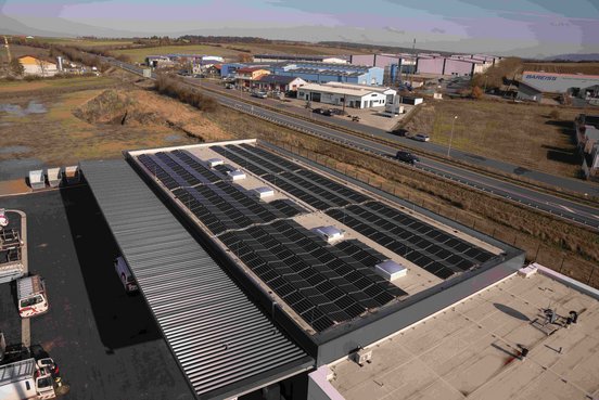 Mitarbeiter*innen können ihre Elektroautos an drei Wallboxen mit insgesamt sechs Ladepunkten laden. Den Strom dafür liefert die PV-Anlage in Ost-West-Ausrichtung auf dem Hallenflachdach. Der Ökostrom, der nicht verbraucht wird, kann im Batteriespeicher mit einer Kapazität von 62 Kilowattstunden (kWh) und 17 kW Leistung "zwischengelagert" und zu sonnenärmeren Zeiten genutzt werden.